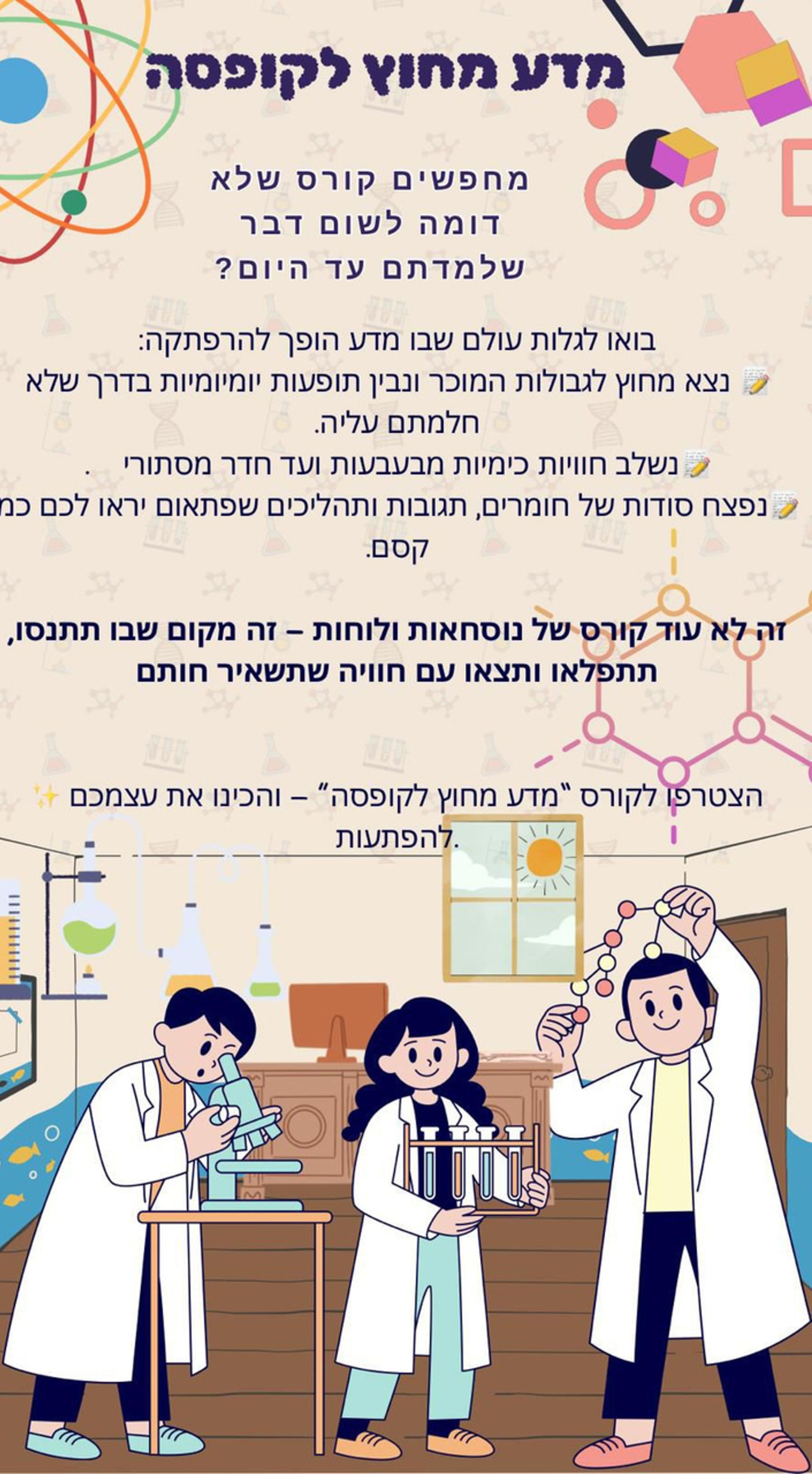 במהלך המפגשים, התלמידים חוקרים, מגלים, מתנסים ביצירה ובעבודת צוות ורואים איך המדע, הטכנולוגיה והעולם שסביבנו מתחברים לחיים האמיתיים!
